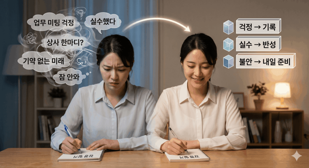 생각을 종이 위로 옮겨 잠시 주차해두는 구체적인 방법입니다. 이 과정은 뇌에게 명확한 종료 신호를 보내는 의식과 같습니다.